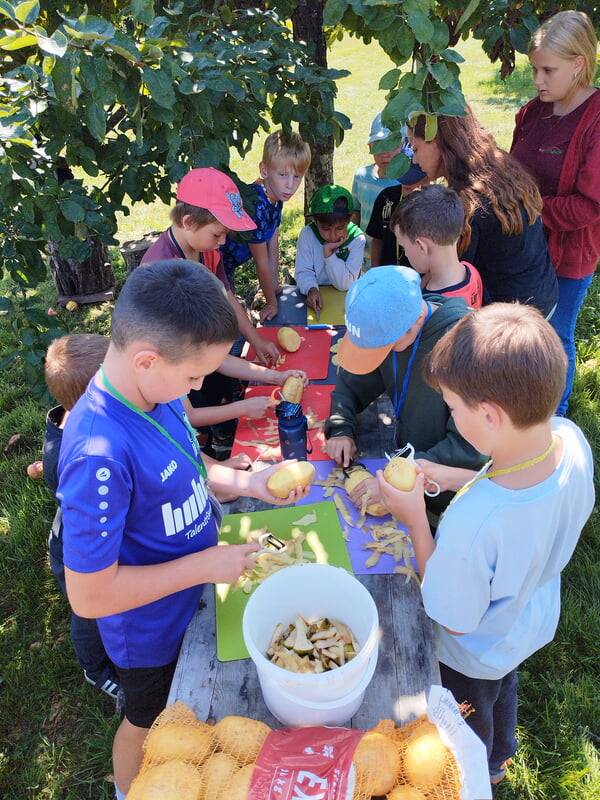 Der Tag schließt mit einer großen Aktion in der ganzen Gruppe ab. Mit Wasserspielen haben wir uns vor der Hitze gerettet, bei einem Geländespiel unsere Strategie und unseren Teamgeist auf die Probe gestellt. Im Wald haben wir entdeckt, gebaut, balanciert und gestaunt. Zum Schluss der Woche wartet immer das Highlight: Alle zusammen bereiten ein Mittagessen vor, das über dem Feuer gekocht wird. Dieses Mal gab es Zucchini-Schnitzel mit Kartoffeln und frischem Salat – direkt auf unserem Feld geerntet und zubereitet. Selten fallen Anbau, Ernte, Verarbeitung und Verzehr so nah zusammen: Die Kinder konnten alles vom Wachsen der Pflanze bis auf den Teller nachvollziehen und beobachten. Hier durften die Eltern auch schon eine Stunde früher dazukommen und mit den Kindern zusammen leckeres Lagerfeuer-Popcorn zum Nachtisch machen.